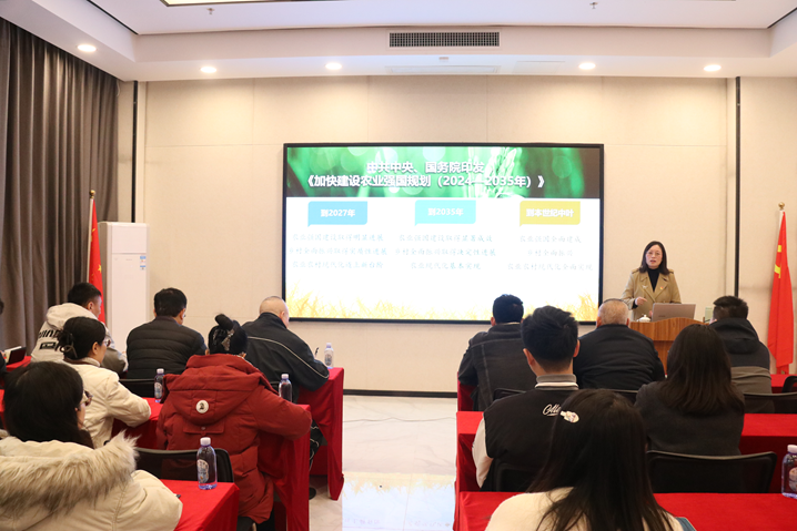 发布时间:2026年01月27日 10:08:29发布者:广西田园股份有限公司  1月26日上午,为深入学习贯彻党的二十届四中全会精神,进一步推动全会精神在广西田园生化股份有限公司(以下简称“广西田园”)落地生根,激发公司党员在新时代农业发展浪潮中的使命担当,广西田园公司党委邀请广西民族大学相思湖学院马克思主义学院秦艳姣老师,开展了一场以“贯彻二十届四中全会精神 阔步迈向农业强国新征程”为主题的专题宣讲会。